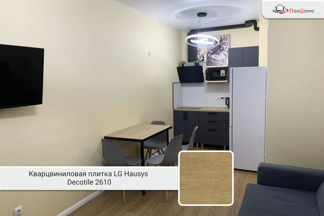 Для этого проекта была подобрана клеевая кварцвиниловая плитка LG Hausys Decotile 2610. Это не просто красивый пол, а настоящий защитник от бытовых неприятностей. Вот её главные козыри:
